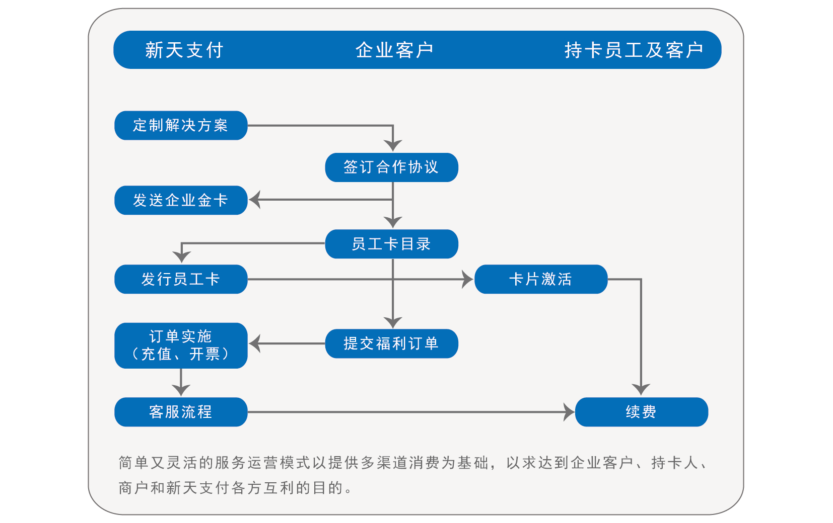 企業(yè)福利發(fā)放往往帶有強制性和定向性,因此無法滿足廣大員工的福利需求,往往會導致事與愿違的結(jié)果。有鑒于此,新天支付為專企業(yè)提供員工福利卡解決方案。 新天支付為企業(yè)量身定制員工福利解決方案,通過簡單、靈活的服務運營模式以提供多渠道消費為基礎(chǔ),以求達到企業(yè)客戶、持卡人、商戶、新天支付互利共贏的目的。 新天支付為企業(yè)建立企業(yè)主卡,同時為企業(yè)每位員工建立員工卡,企業(yè)可以統(tǒng)一為員工卡進行賬戶管理,通過智能、便捷的 能夠充分滿足企業(yè)差旅補貼、通訊補貼、節(jié)假日福利、業(yè)務補貼、飲食補貼、服裝補貼等多種福利發(fā)放形式。